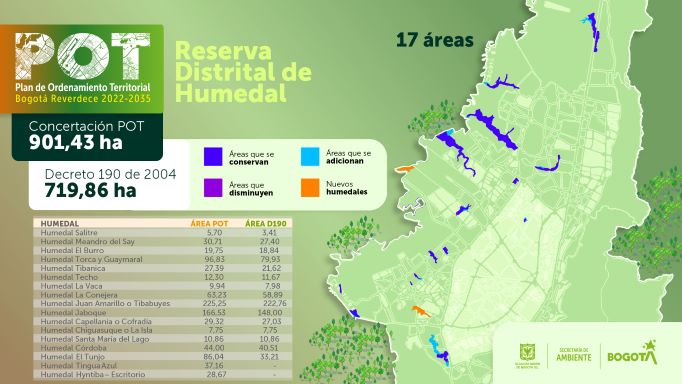 Además, se amplía el área en toda Bogotá en un 20 %, al pasar de 719 a 901 hectáreas de áreas protegidas para conservar humedales.